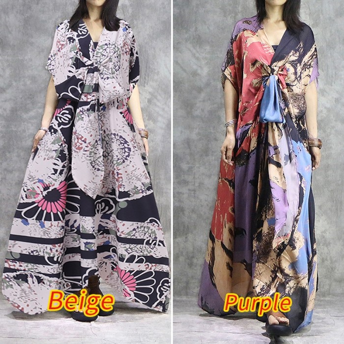 2019 Baru Wanita Gambar Bunga Garis Panjang Gaun Leher V Seksi Sleevele Tombol Pantai Kasual BoHo Midi Gaun Plus Ukuran 3XL vestidos|Gaun| - AliExpress