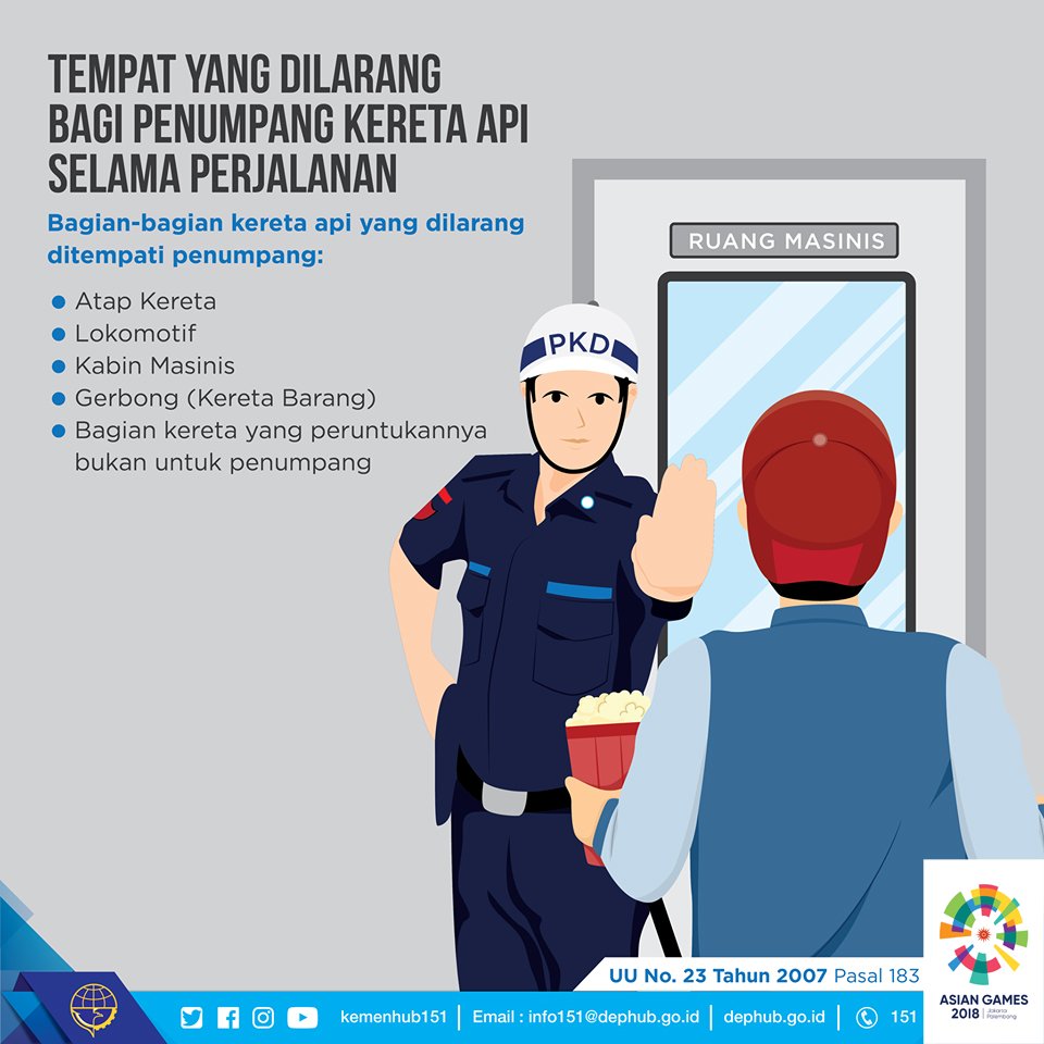 Kemenhub RI Twitterissä: “#KawulaModa, ada beberapa bagian didalam kereta api yang tidak boleh ditempati oleh penumpang, tempat apakah itu? Yaitu atap kereta, lokomotif, kabin masinis, gerbong-gerbong barang, juga di dalam kereta yang