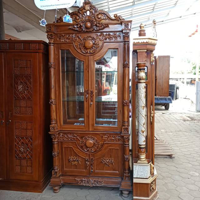 Lemari Hias Ukiran Jati Salur 2 Pintu, Furniture Ukiran Jepara, Lemari Kaca | Shopee Indonesia