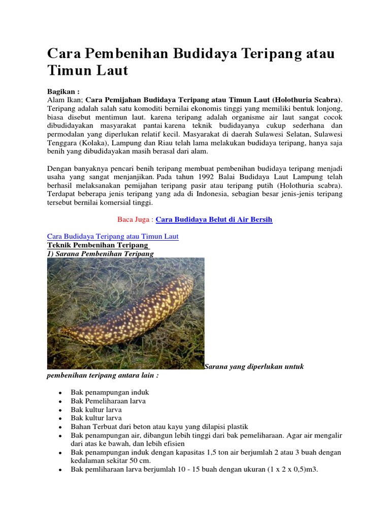 Cara Pembenihan Budidaya Teripang Atau Timun Laut