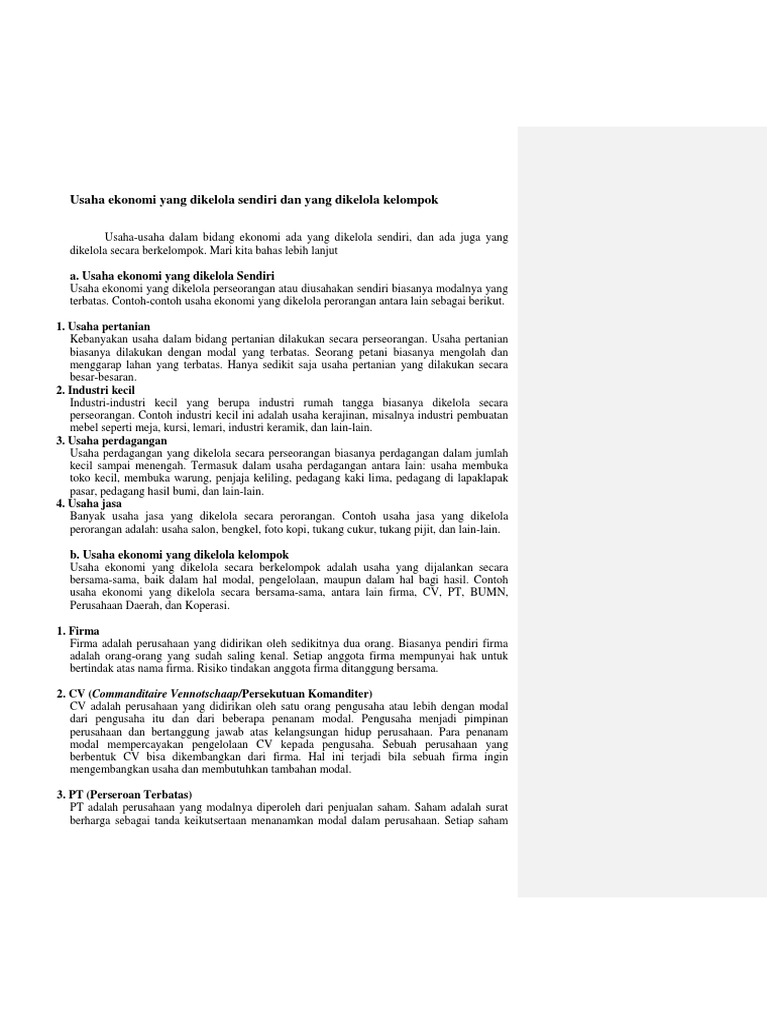 Usaha Ekonomi Yang Dikelola Sendiri Dan Yang Dikelola Kelompok