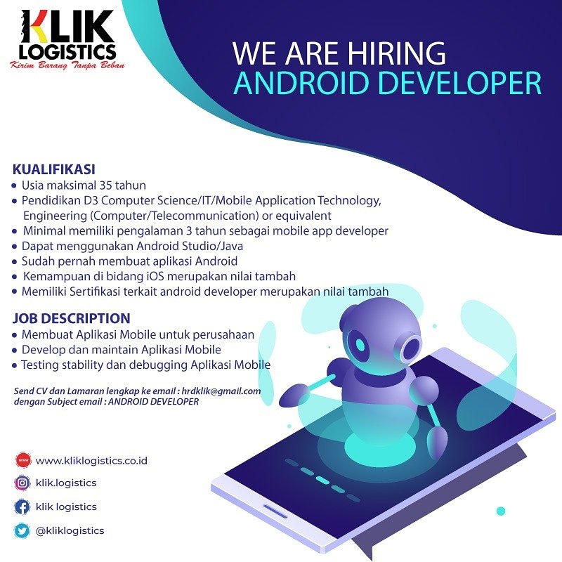 KLIK LOGISTICS : “PT. KLIK LOGISTICS PUTERA HARMAS : Posisi : Android developer Penempatan di Bintara, Bekasi Barat. . Jika memenuhi kriteria langsung mengirim CV dan Lamaran ke alamat email kami