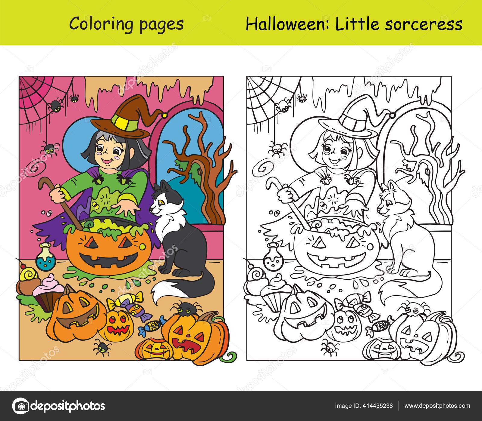 Halaman Pewarnaan Vektor Dengan Contoh Warna Penyihir Kecil Memasak Pot — Stok Vektor © Alinart #414435238