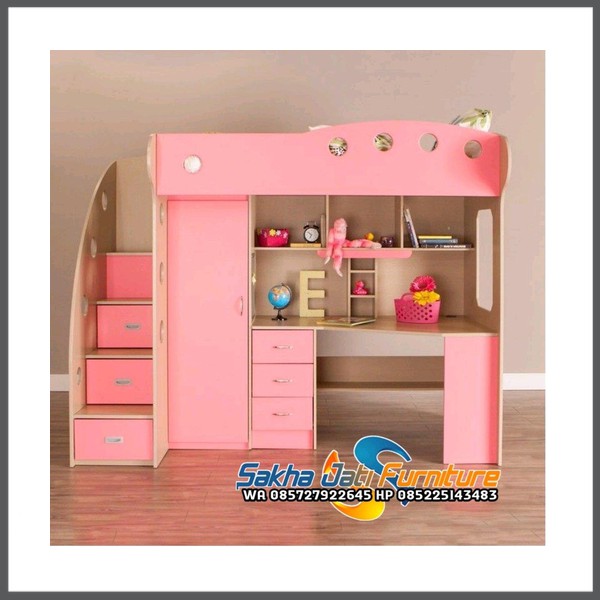 Kasur Tingkat Anak Perempuan Pink Putih With Lemari Pakaian Meja Belajar - Tempat Tidur Anak Minimalis