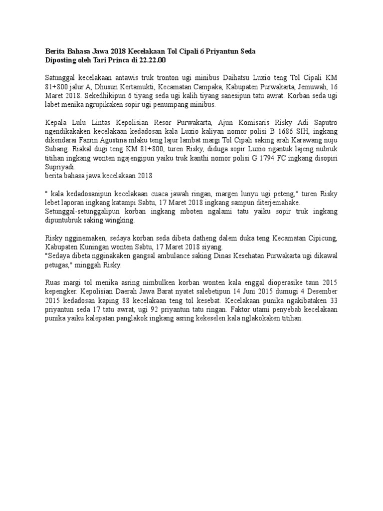 Berita Bahasa Jawa 2018 Kecelakaan Tol Cipali 6 Priyantun Seda Kelas 10