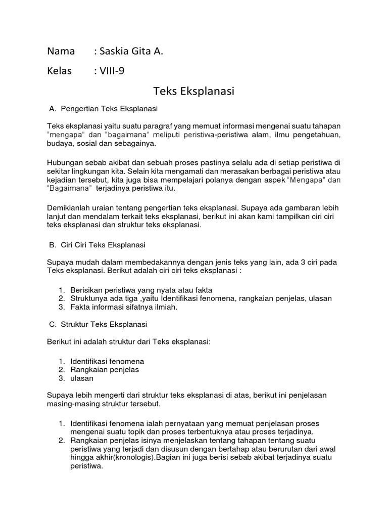 Teks Eksplanasi: Nama: Saskia Gita A. Kelas: VIII-9