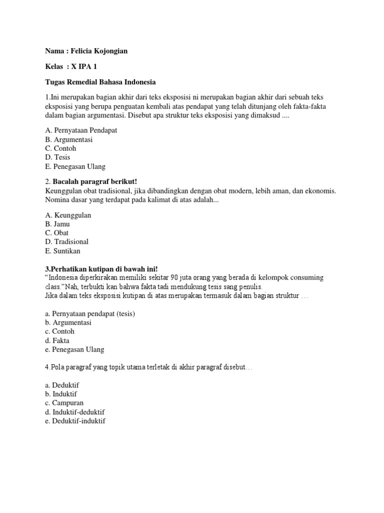 Nama: Felicia Kojongian Kelas: X IPA 1 Tugas Remedial Bahasa Indonesia