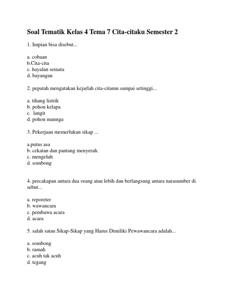 Soal Tematik Kelas 4 Tema 7 Cita-citaku Semester 2