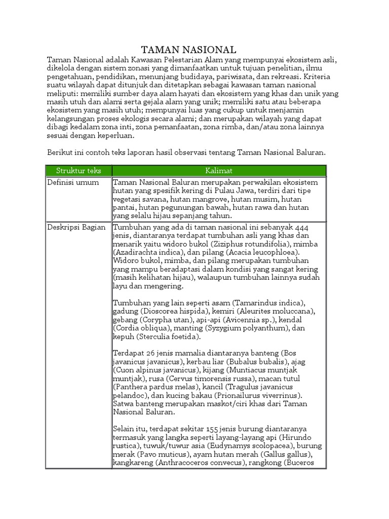 Contoh Struktur Teks Laporan Hasil Observasi Tentang Taman Nasional