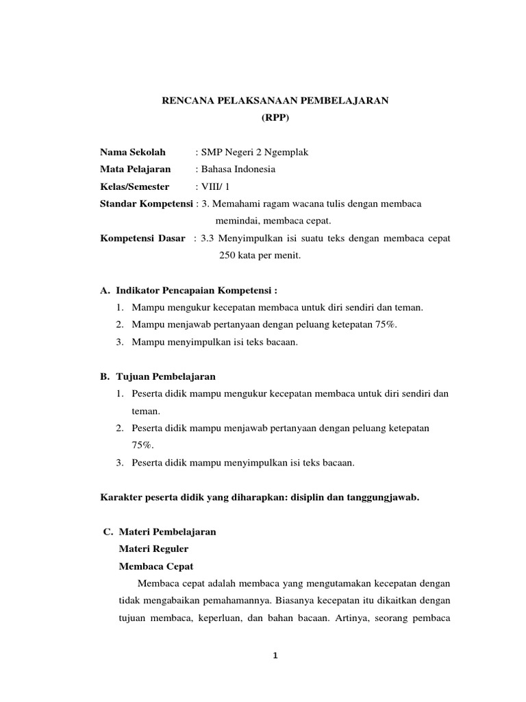 PDF) RPP MEMBACA CEPAT BAHASA INDONESIA KELAS X | Arief Kurniatama - Academia.edu