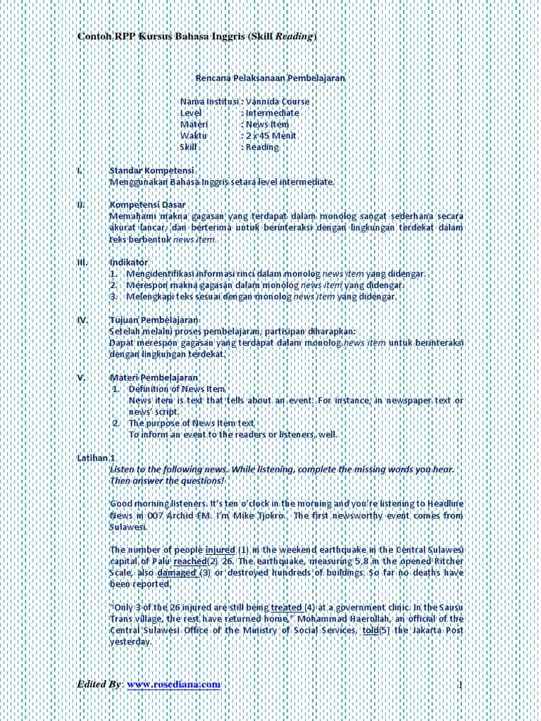 Contoh RPP Kursus Bahasa Inggris (Skill Reading): Rencana Pelaksanaan Pembelajaran | Earthquakes | Public Opinion