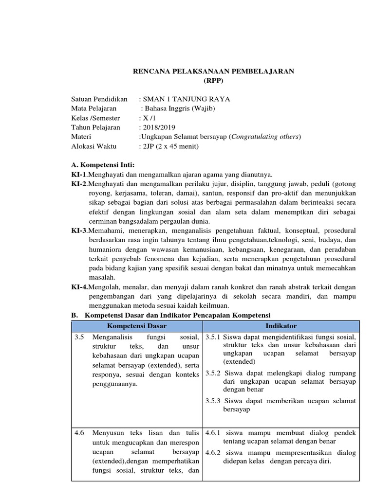 RPP Bahasa Inggris K13 Kelas X SMA tentang Ungkapan Selamat Bersayap – BukuInggris.Co.Id