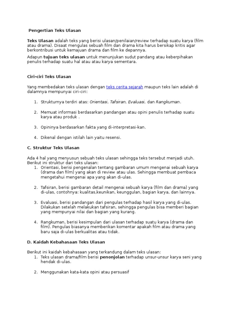 Teks Ulasan : Contoh, Struktur, Tujuan, Ciri-Ciri dan Kaidah Teks Ulasan