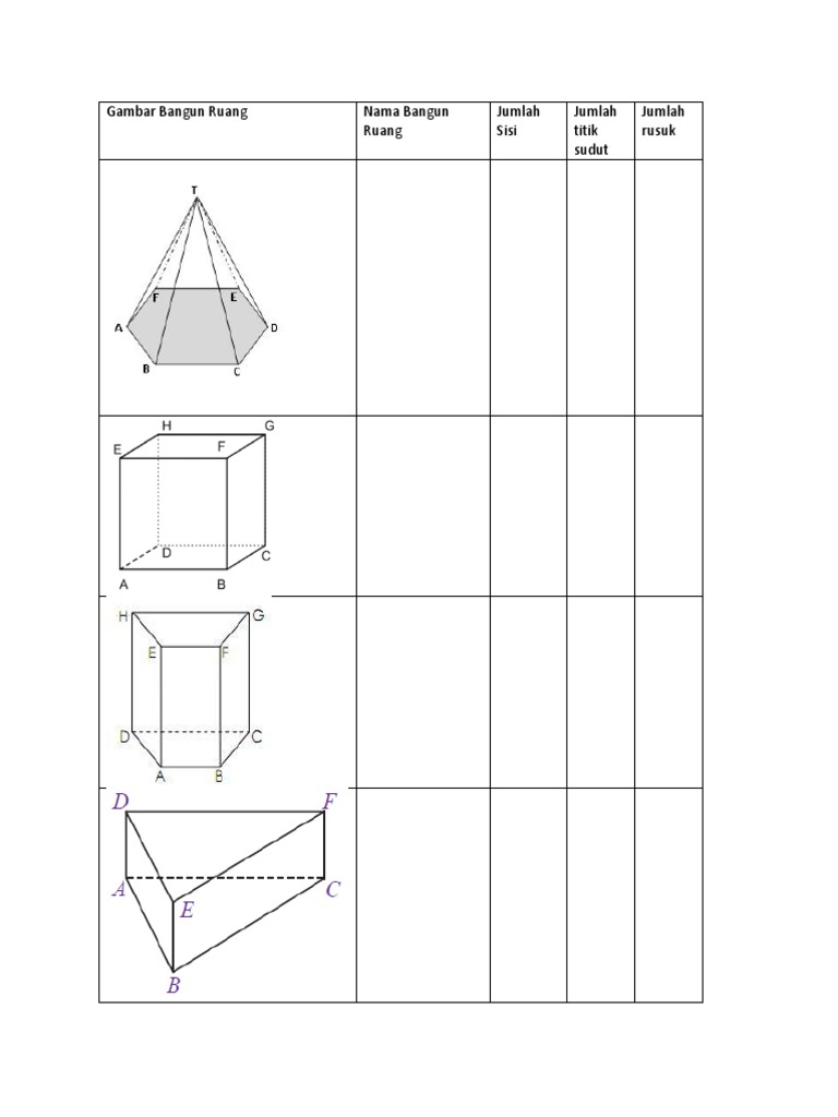 tentukan nama bangun ruang beserta banyak sisi,rusuk,dan titik sudut dari masing masing bangun - Brainly.co.id